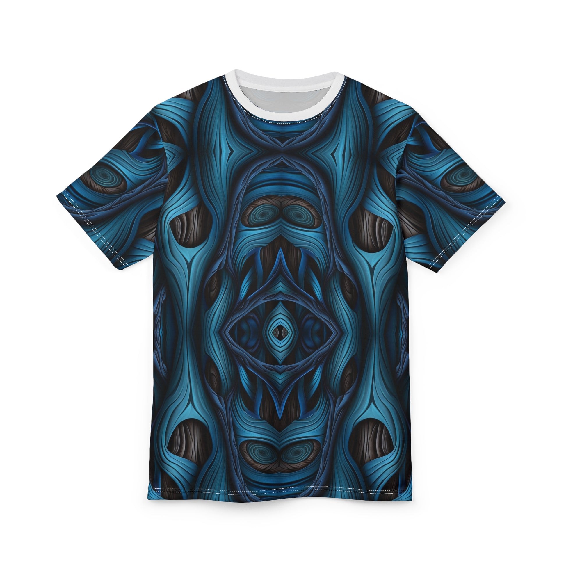 Dive into style with this mesmerizing deep blue abstract tee. The swirling, layered design resembles flowing currents, woodgrain, and futuristic patterns all at once—creating a hypnotic effect that feels both organic and otherworldly. With bold shades of blue accented by black and subtle highlights, this shirt radiates depth, mystery, and modern edge.