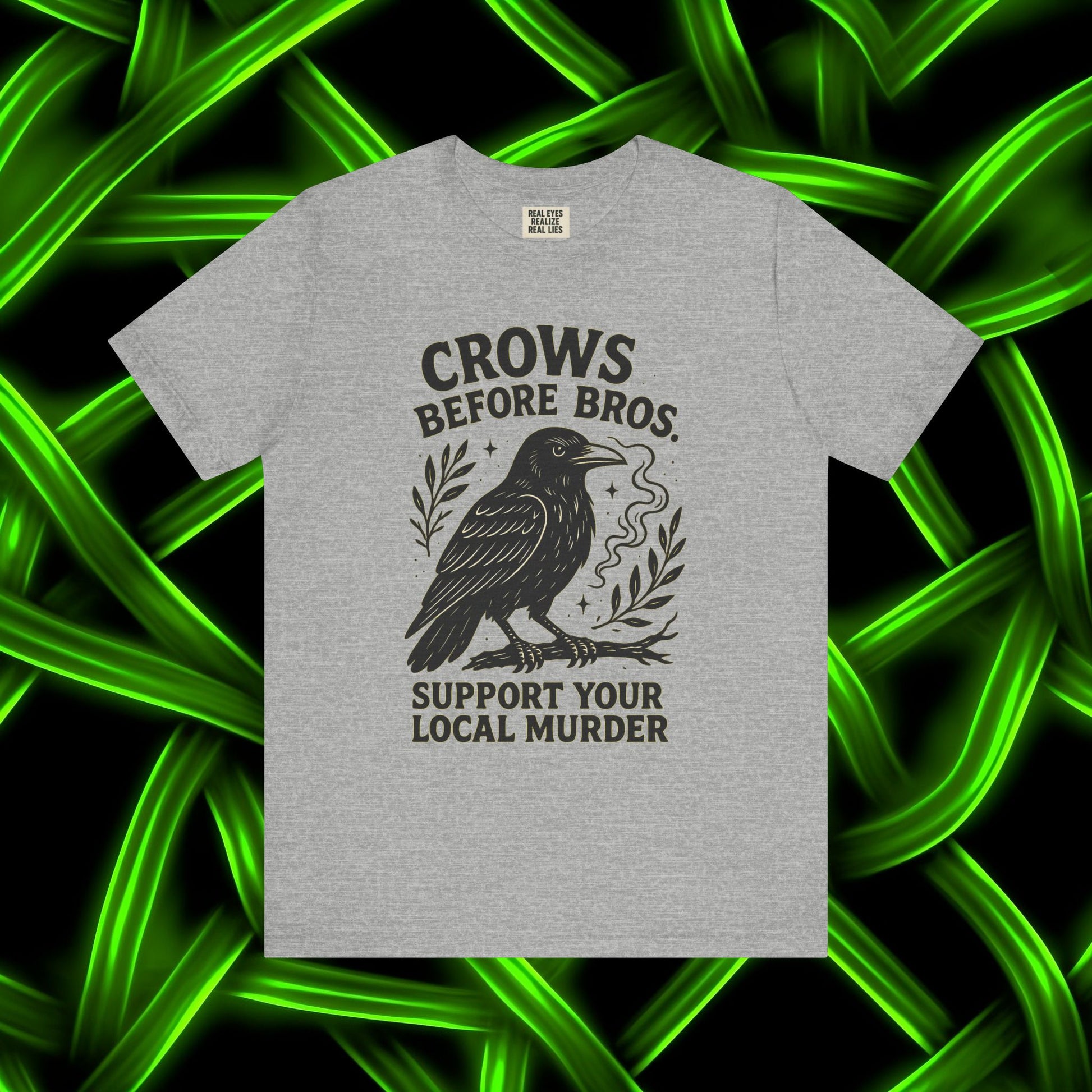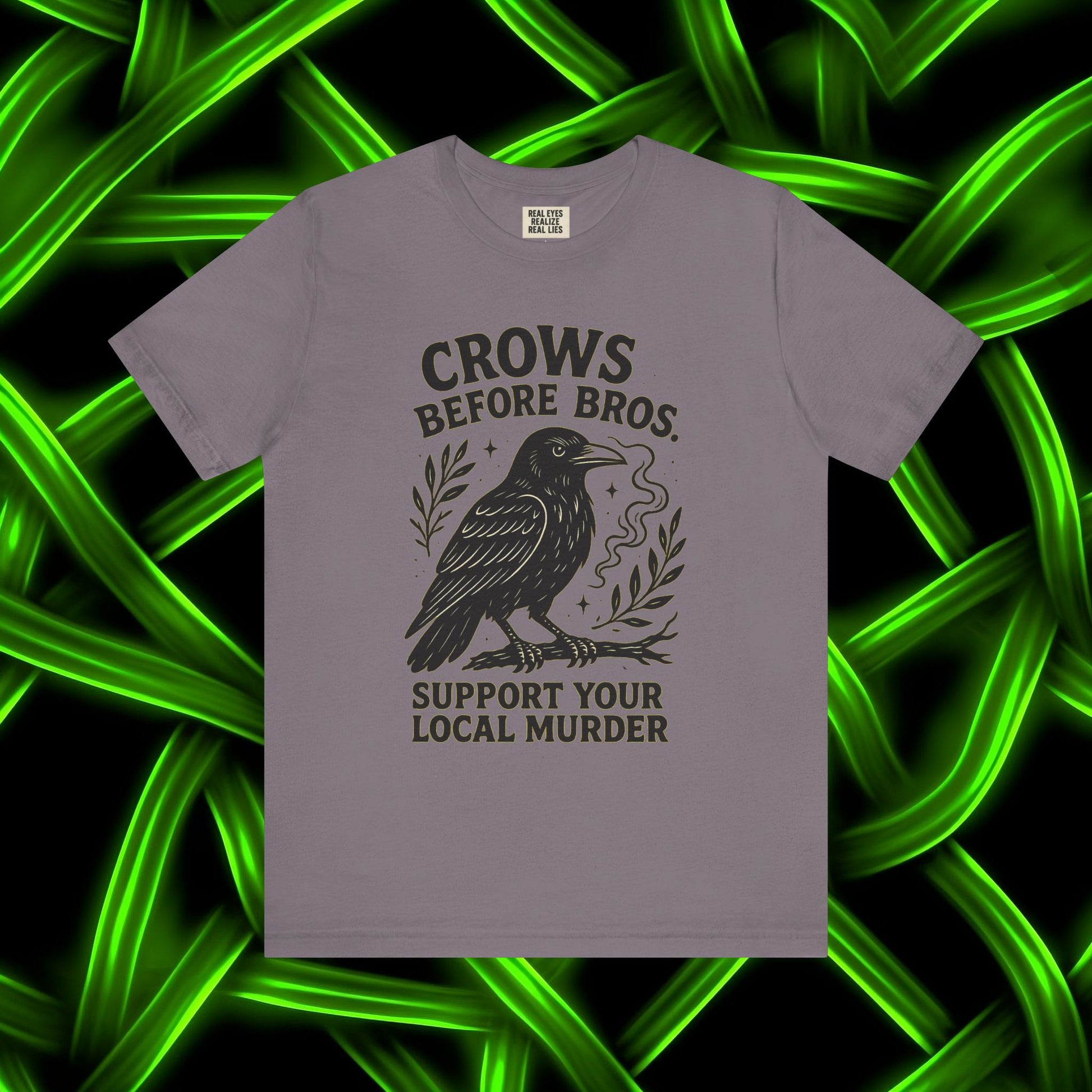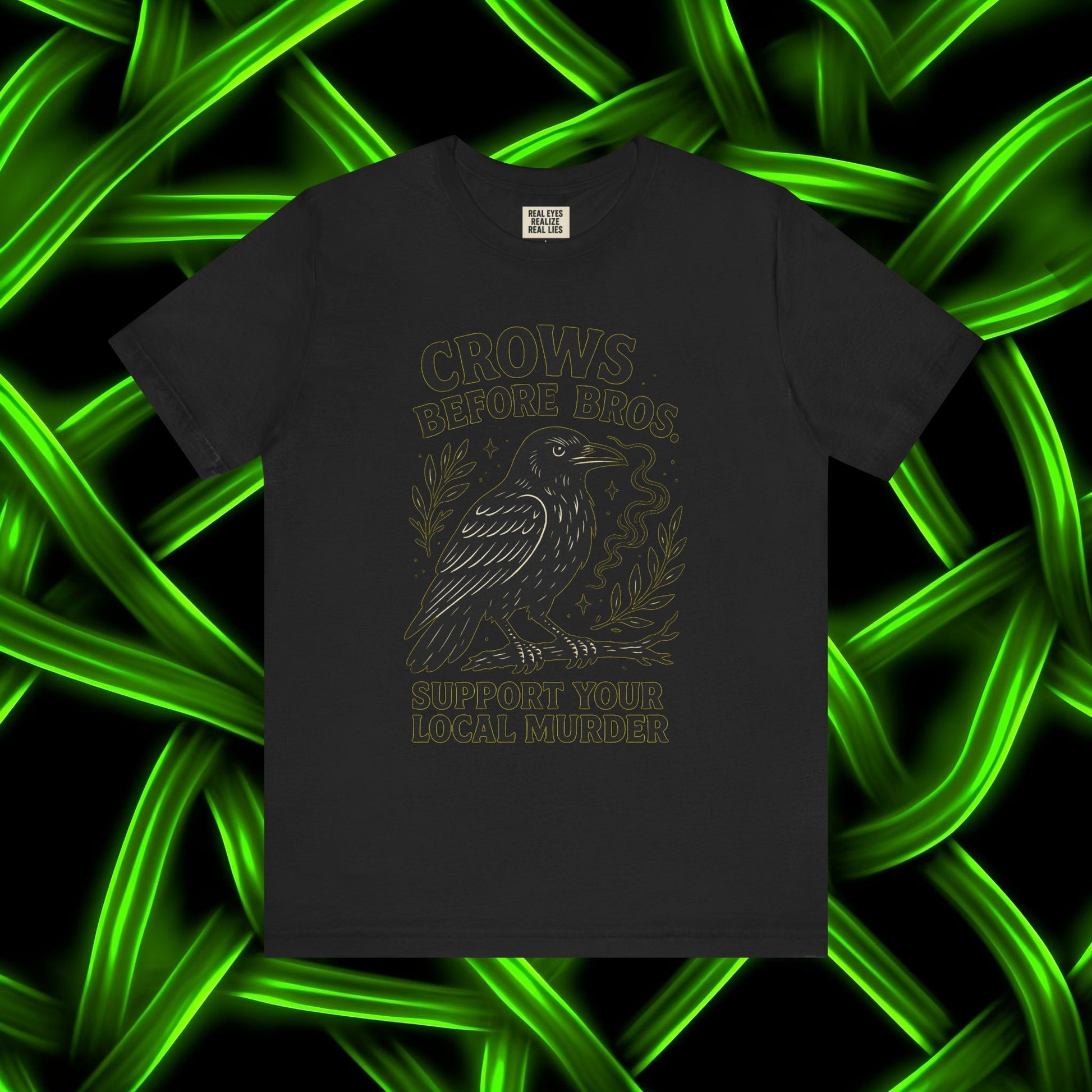 This high-contrast crow design features a confident, sentry-style bird surrounded by subtle magical details—stars, branches, and smokey flourishes—with the phrases: