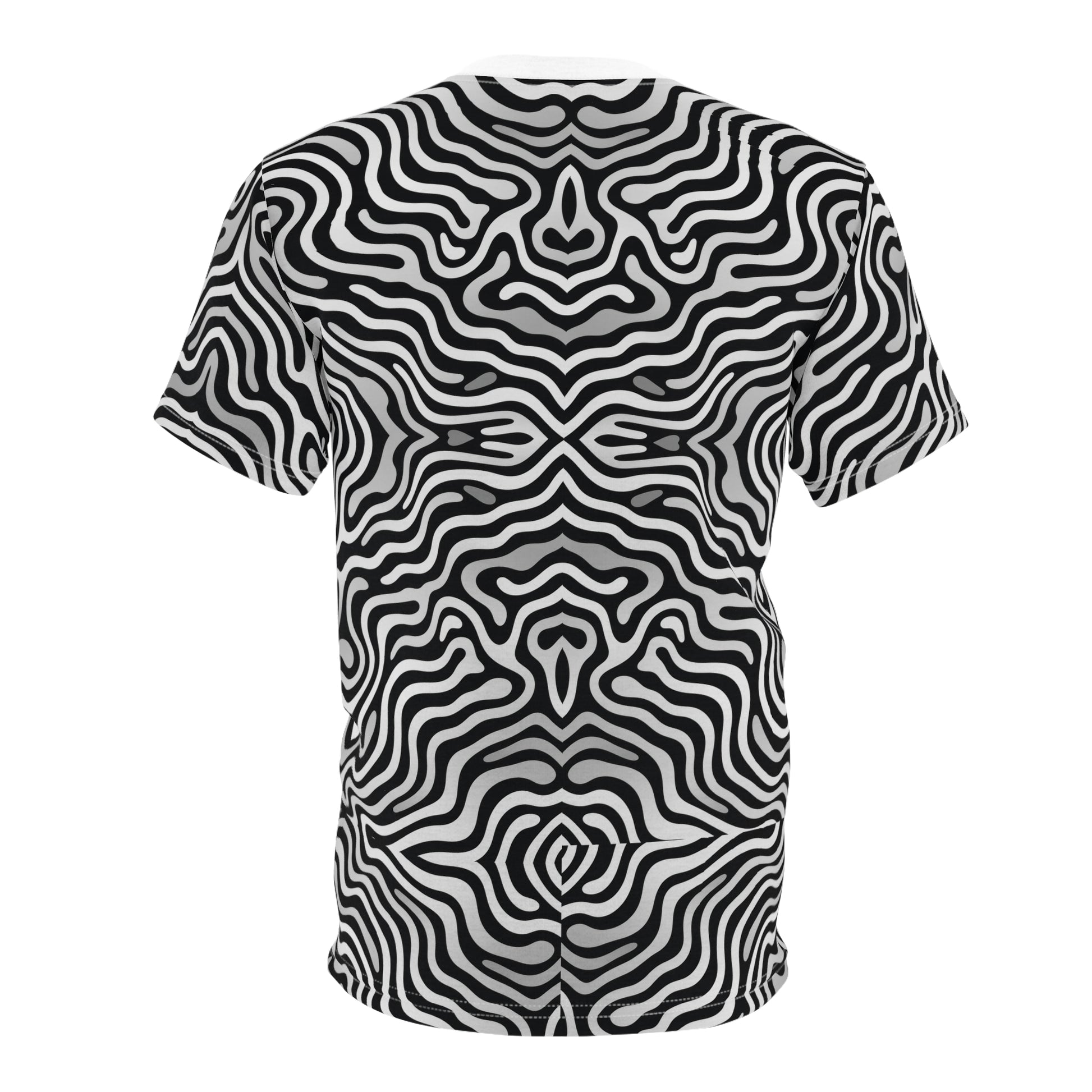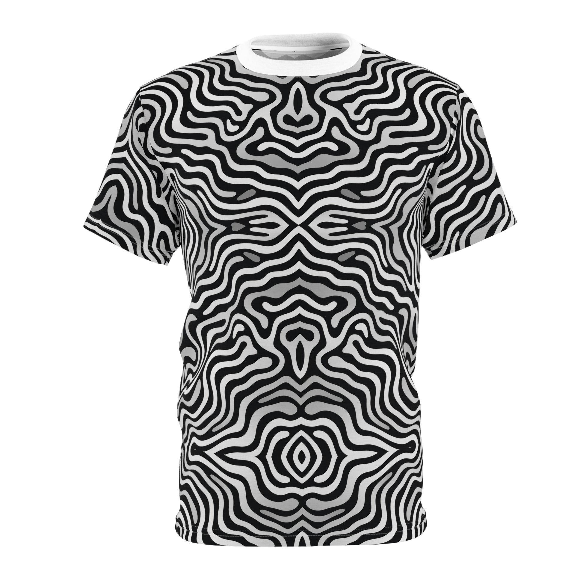 Step into the surreal with this mind-bending black-and-white graphic tee. Featuring a mesmerizing mirrored wave pattern, this design creates a bold optical illusion effect that feels alive with movement. Sleek, modern, and hypnotic, it’s the perfect shirt for those who love turning heads and sparking curiosity.
